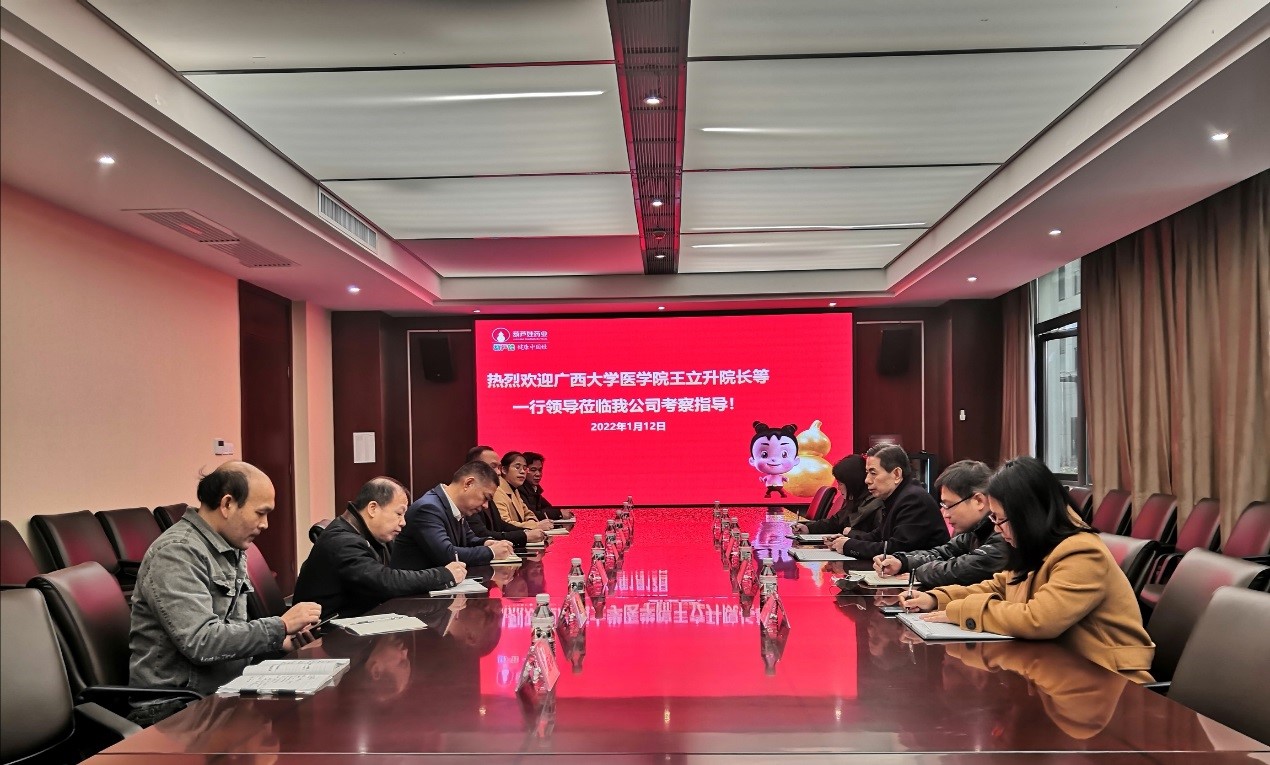 2022年1月12日上午,由常务副经理王立升教授带队,教师刘旭、黄爱民、袁明清及科研秘书伍娟组成一行人员赴葫芦娃药业全资子公司广西维威制药有限公司考察交流。双方就校企合作和人才培养等事宜进行了广泛而深入的座谈。