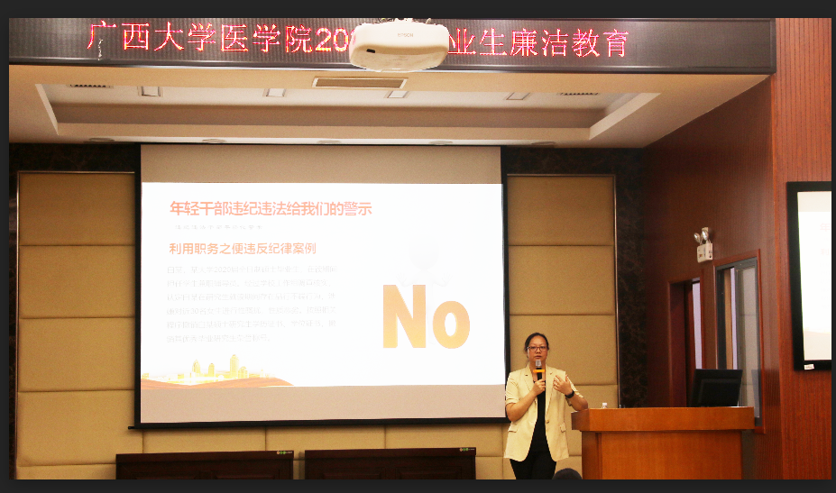 李莉老师向同学们强调,年轻干部要明晰“权责对等”。现在社会不少年轻干部因能力强、进步快,顺利得到提拔,走上领导岗位。但部分人由于对自身手中的权力没有清醒的认识和敬畏,最终踏上贪腐“不归路”。李老师通过数个社会上的年轻干部以及曾经的优秀员工的违纪违法行为的案例警示同学们要严格要求自己,杜绝违法违纪行为的发生;讲解了伪造、篡改、买卖或代写论文等20种科研不端行为,这对于毕业生们,特别是即将进入科研事业的准研究生们起到一个警醒作用。