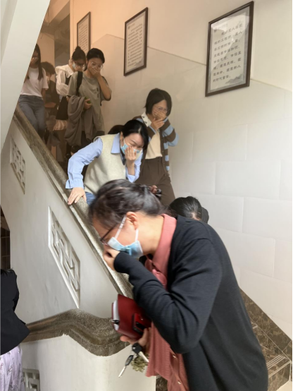 宣讲培训结束后在公司办公楼开展消防疏散演练。公司师生用手捂着口鼻、弯腰扶墙沿楼梯撤离,疏散及时有序,达到了演练效果。