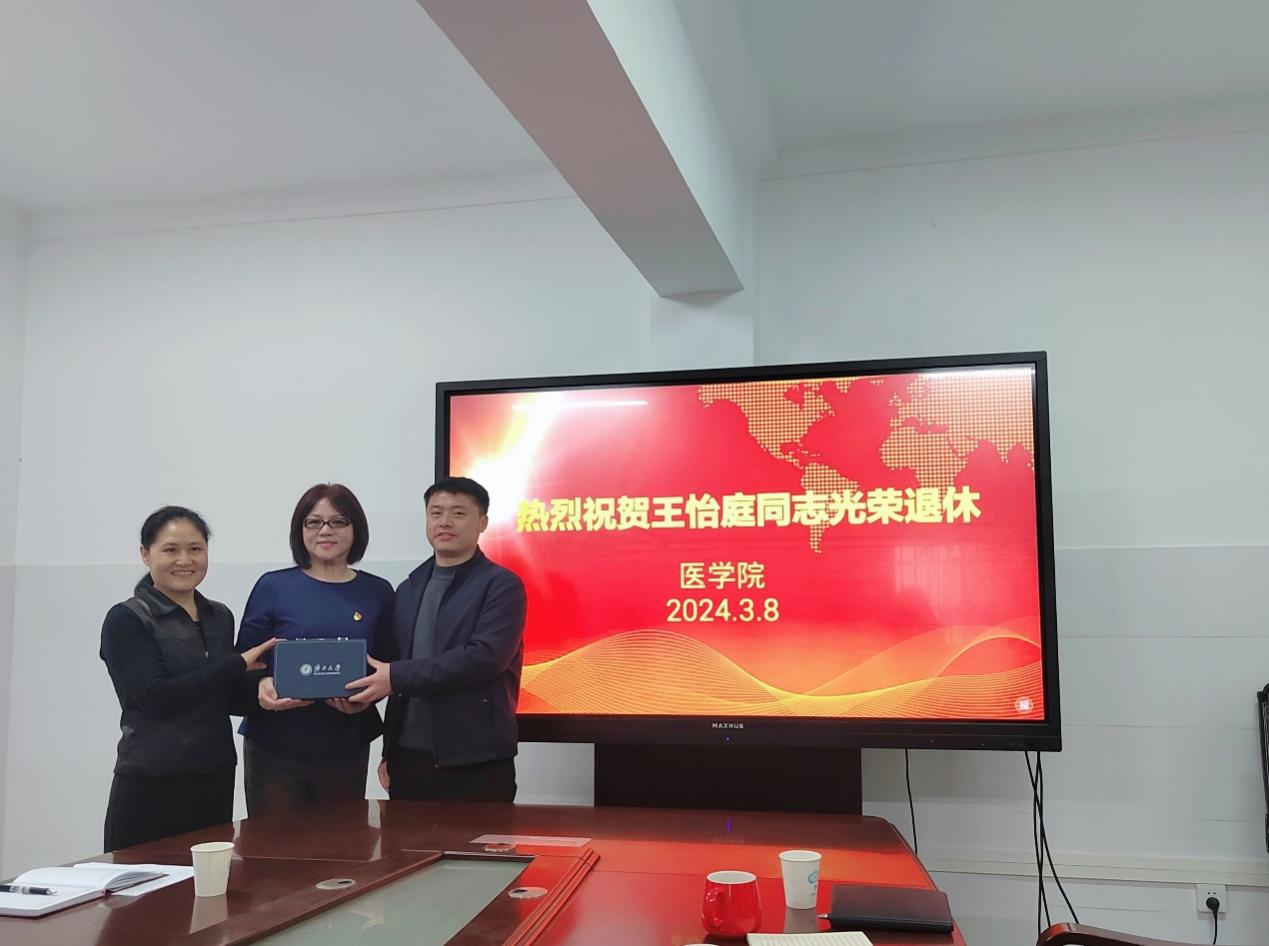 3月8日上午,太阳成集团tyc122cc举办了“王怡庭同志荣退仪式”,公司党委书记李波、学术经理罗素兰及其他教职工代表参加仪式。