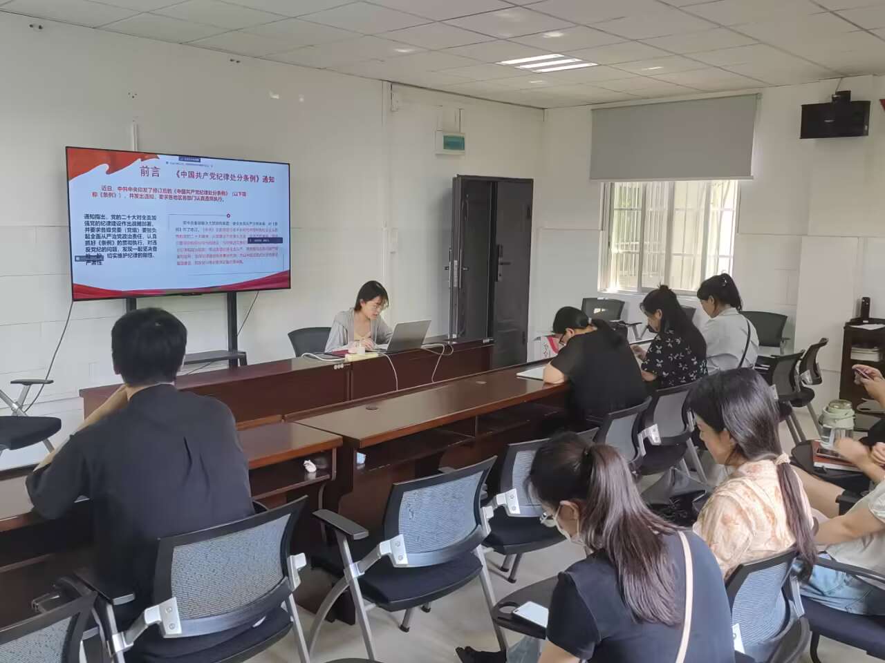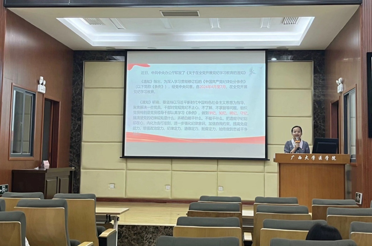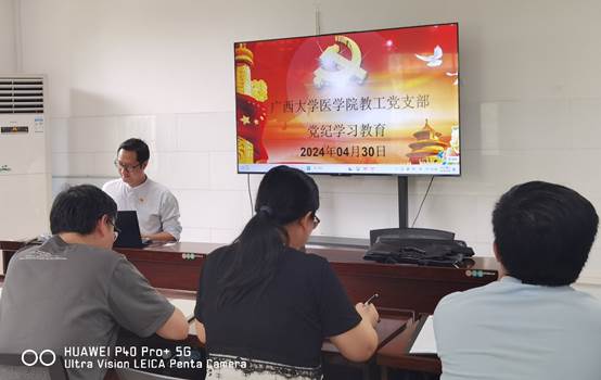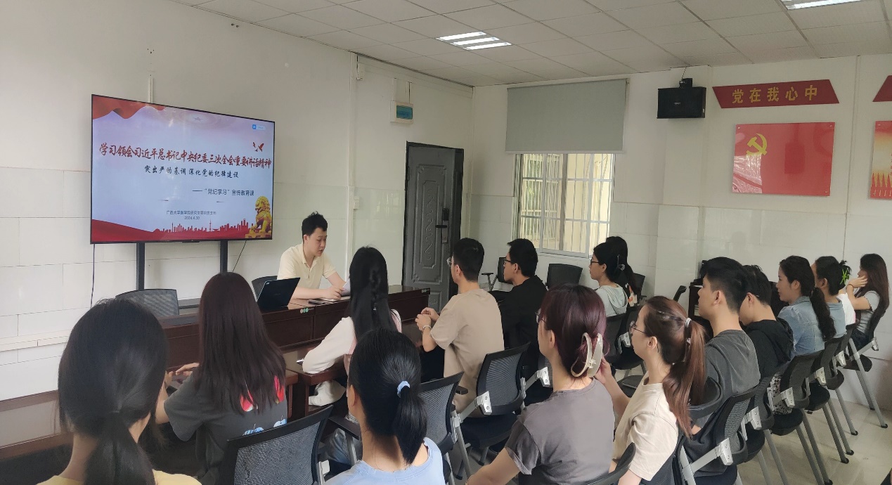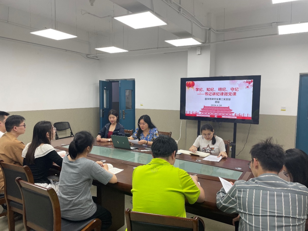 研究生第二党支部于4月25日召开党支部支委会议,学习贯彻习近平总书记关于党纪学习教育的重要讲话和重要指示精神,并部署党支部党纪学习教育工作。4月30日,党支部书记蒋琼同志为支部党员上党课,强调党纪学习教育要注重融入日常教育,要纳入“三会一课”、主题党日活动中。支部党员要原原本本学、联系实际学。针对在校外实验员工等群体的实际情况,灵活组织开展学习,做到党纪学习教育支部党员全覆盖。