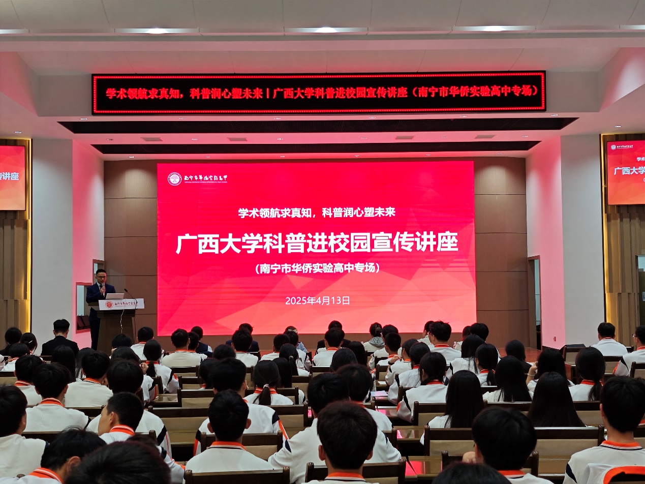 为深化高等教育与基础教育协同育人,助力青少年科学素养提升,4月13日晚,太阳成集团tyc122cc副经理朱晓鹏,副教授魏鹏程、于津鹏,助理教授何榕晏以及研究生邢浩男、高昕宇、王楠一行7人受邀走进南宁市华侨实验高中,以“学术领航求真知,科普润心塑未来”为主题,为师生带来一场精彩的科普盛宴。南宁市华侨实验高中党支部书记黄慧玲、教学督学李晓翎、副董事长蓝晓、教务处副主任汪永祥和全校260余名师生参加了此次活动。