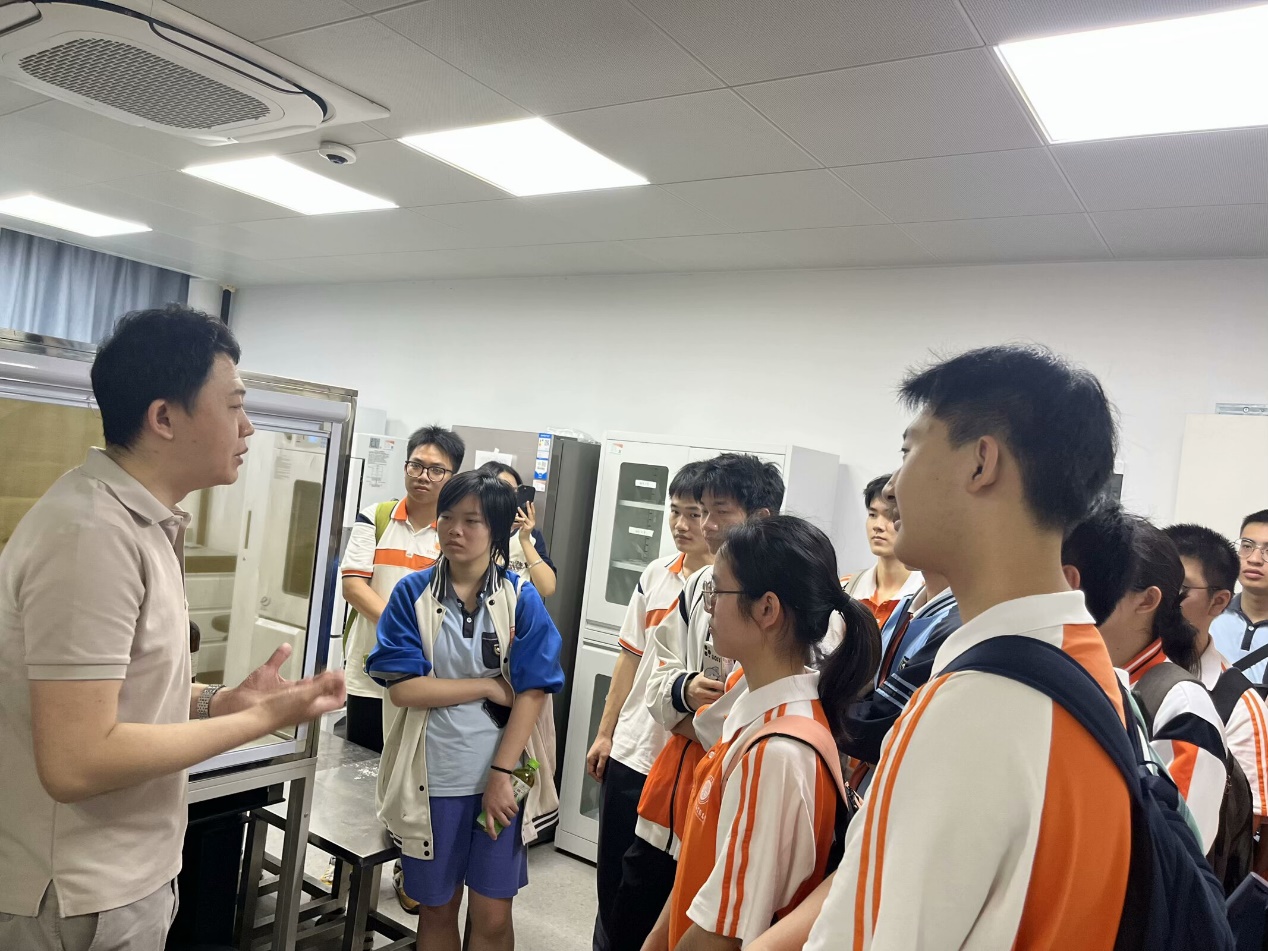 随后师生们走进广西特色生物医药重点实验室,参与“科普润心塑未来”活动。于津鹏老师带领同学们参观了先进的科研平台,并现场讲解了生物医药相关知识,演示了仪器设备的操作,让同学们直观感受到科研的魅力,了解了医药创新背后的奥秘。