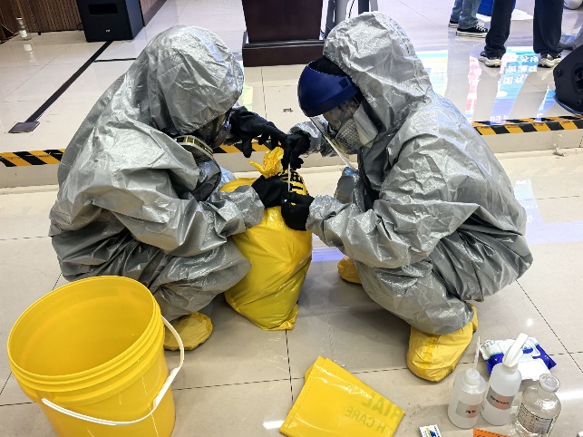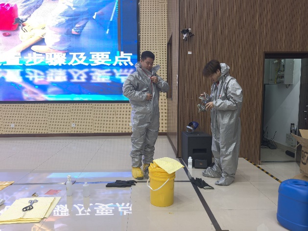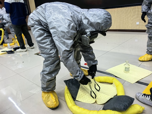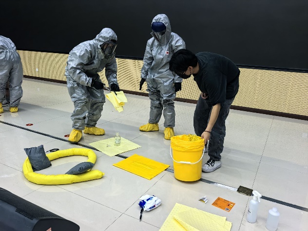 活动伊始,师生领取防护物资后,重点学习防护装备穿戴规范、吸附棉使用等处置要点。实操环节通过分组训练强化身体/面部/手足防护装备穿戴,模拟酸性试剂泄漏场景开展协作处置演练。互动抢答与抽签模拟环节有效检验学习成果,参训人员展现出良好的应急反应能力。