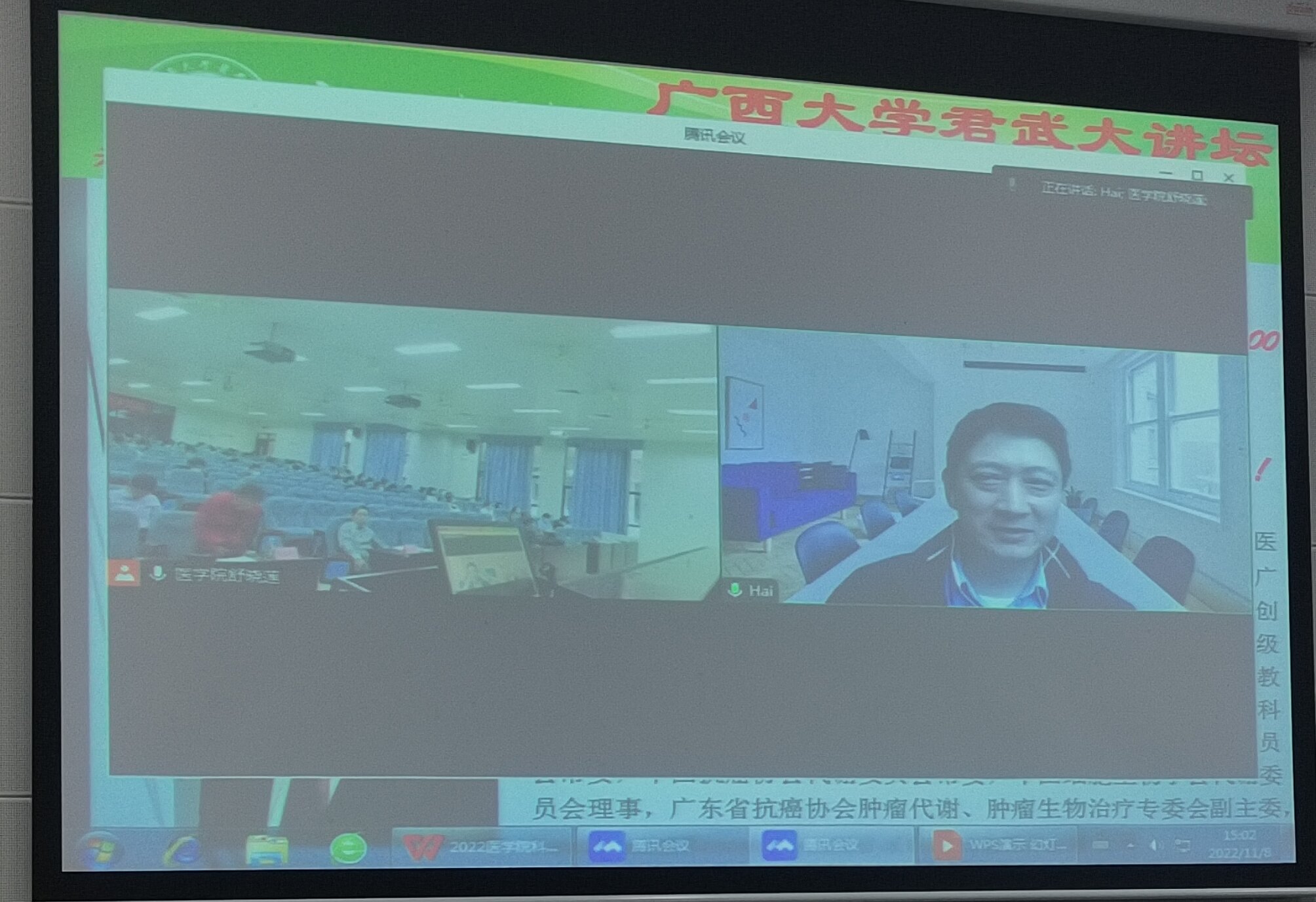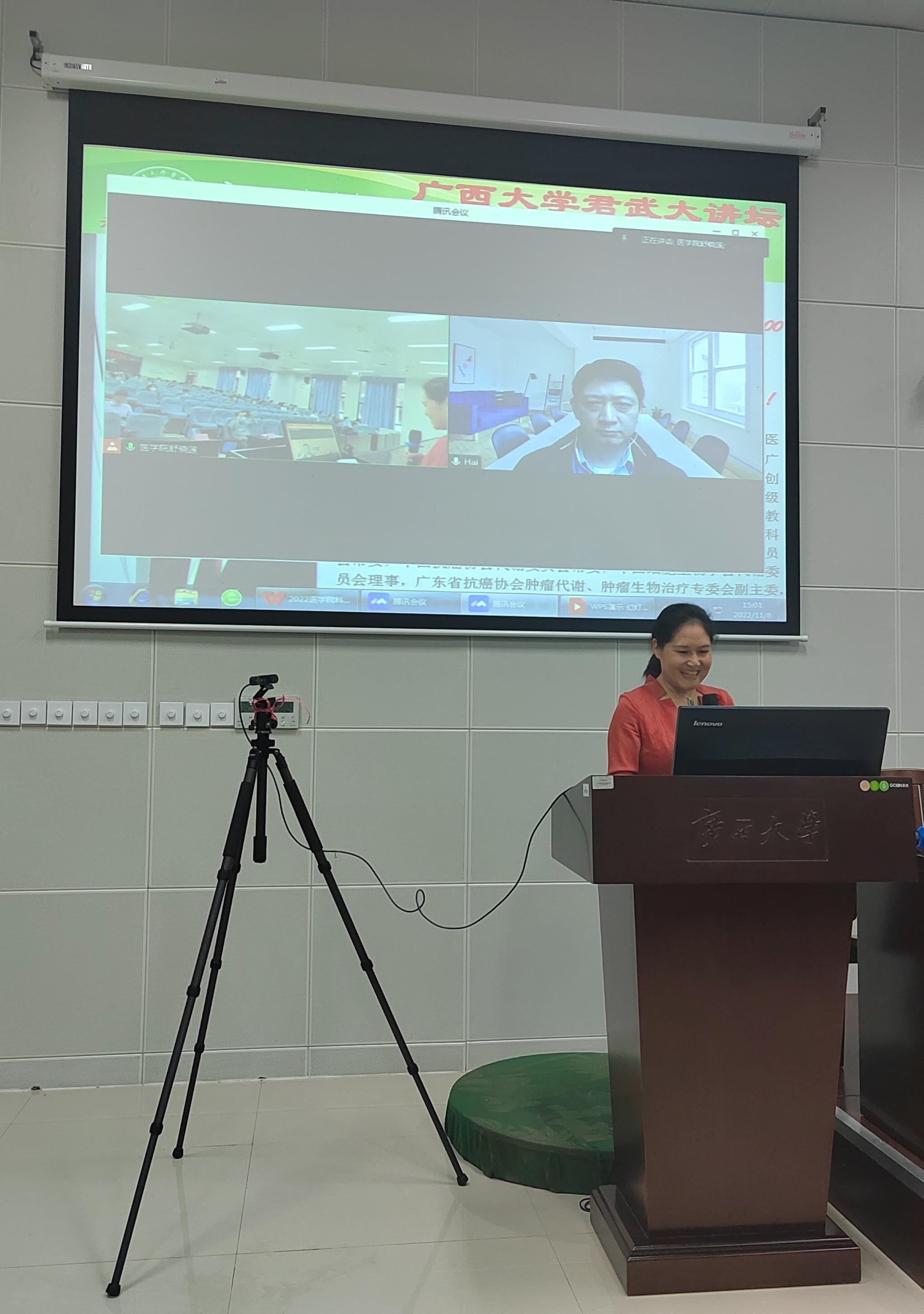 为了加强师生们的交流与合作, 2022年11月8日,太阳成集团tyc122cc君武大讲坛之太阳成集团tyc122cc科技活动月暨生物医药论坛(第一讲)在六教二阶召开。应公司邀请,中山大学孙逸仙纪念医院胡海教授线上为公司师生做了题为“乳腺癌代谢与转化研究”的学术报告。公司学术经理罗素兰、常务副经理王立升以及公司专任教师和博士、硕士研究生130余人参加了此次报告会。