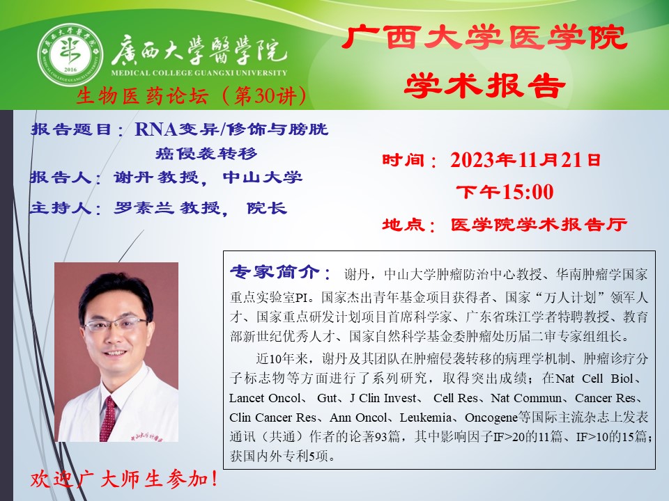 太阳成集团tyc122cc生物医药论坛(第30讲):RNA变异/修饰与膀胱癌侵袭转移